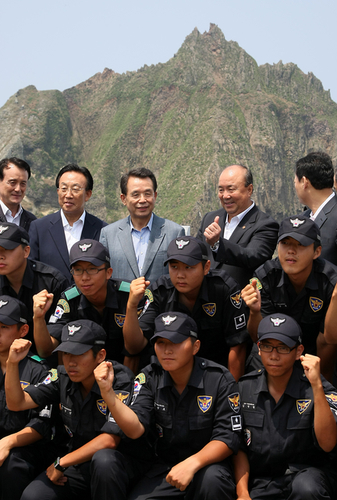 29日上午,韓升洙總理(后排居中)在獨島鼓勵守備警員們并同他們一起拍照留念。這是韓國總理首次探訪獨島。[韓國媒體圖片]