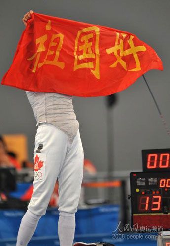8月11日,北京奧運會女子花劍個人1/32決賽在擊劍館進行,50歲的欒菊杰代表加拿大出戰,并以13比9戰勝突尼斯選手伊娜·布貝克里。面對全場觀眾不息的掌聲和歡呼聲,欒菊杰掏出一塊紅布上寫著"祖國好"的橫幅向觀眾致謝。此情此景感動著每一個人。圖為欒菊杰獲勝后高舉“祖國好”。(來源:人民網)