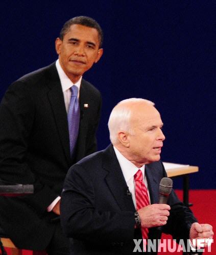 圖為10月7日,美國民主黨總統候選人、伊利諾伊州國會參議員奧巴馬(左)與共和黨總統候選人、亞利桑那州國會參議員麥凱恩在位于田納西州納什維爾市的貝爾蒙特大學舉行今年大選的第二場總統候選人辯論。新華社記者張巖攝