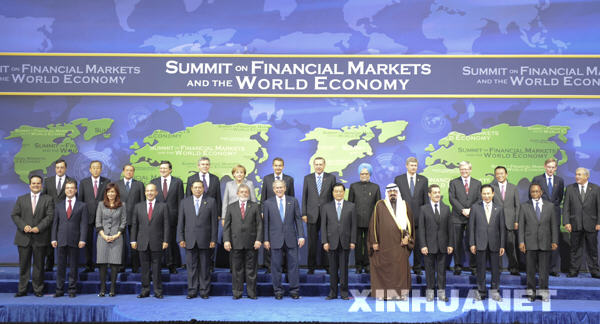 11月15日,中國國家主席胡錦濤在華盛頓出席二十國集團領導人金融市場和世界經濟峰會。這是與會各國領導人合影。新華社記者李學仁 攝