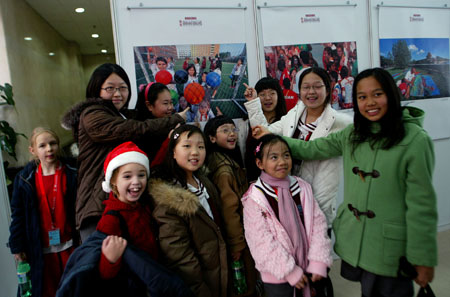 北京加拿大國(guó)際學(xué)校的孩子們?cè)谡褂[作品前合影留念。