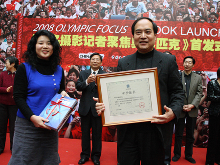 中國(guó)日?qǐng)?bào)總編輯朱靈向中央檔案館贈(zèng)予《百名攝影記者聚焦奧林匹克》畫(huà)冊(cè)。
