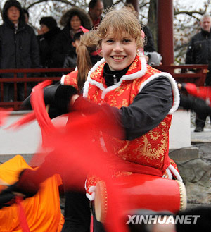 1月24日,在瑞典首都斯德哥爾摩,一名瑞典姑娘跳起歡快的中國(guó)腰鼓舞,慶祝中國(guó)農(nóng)歷牛年的到來(lái)。當(dāng)天,瑞典東亞博物館、瑞京華人協(xié)會(huì)和中國(guó)駐瑞典大使館聯(lián)合舉辦迎接中國(guó)春節(jié)的活動(dòng)。(新華社記者吳平攝)