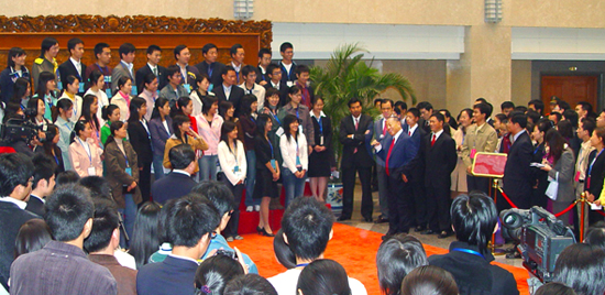 中國(guó)日?qǐng)?bào)網(wǎng)環(huán)球在線消息:“平等中尋覓摯友,以誠(chéng)實(shí)營(yíng)造自我,你是中國(guó)!”在外交部橄欖廳,李肇星部長(zhǎng)滿懷深情地朗誦起他的詩(shī)《青春中國(guó)》。圍繞在他身旁的是來(lái)自北京大學(xué)、清華大學(xué)、中國(guó)人民大學(xué)、北京師范大學(xué)、北京外國(guó)語(yǔ)大學(xué)、外交學(xué)院、國(guó)際關(guān)系學(xué)院、北京語(yǔ)言大學(xué)、對(duì)外經(jīng)濟(jì)貿(mào)易大學(xué)、中國(guó)政法大學(xué)、中國(guó)傳媒大學(xué)、北京第二外國(guó)語(yǔ)學(xué)院等12所首都高校的180多名大學(xué)生,他們正興致勃勃地參加外交部舉辦的首次大學(xué)生專場(chǎng)“公眾開放日”活動(dòng)。