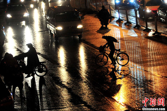 9月25日晚,即將進入“史上最長黃金周”的北京在9月的最后一周迎來了全年的“最堵周”。當日中午前后,北京大部出現降雨,局地雨量較大,能見度較低,加上節前交通流量增大,傍晚全市路網交通指數已經達到8.7,處于嚴重擁堵狀態。圖為橫穿馬路的騎車人。中新網記者金碩 攝