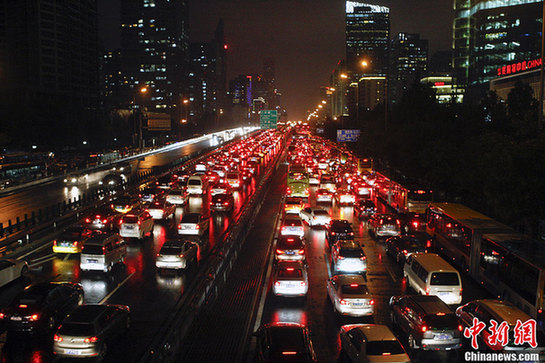 9月25日晚,即將進入“史上最長黃金周”的北京在9月的最后一周迎來了全年的“最堵周”。當日中午前后,北京大部出現降雨,局地雨量較大,能見度較低,加上節前交通流量增大,傍晚全市路網交通指數已經達到8.7,處于嚴重擁堵狀態。圖為北京大北窯地區眾車輛擁堵情況較為嚴重。中新社發張浩 攝