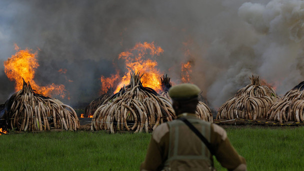 2016年4月30日,肯尼亞總統(tǒng)胡魯·肯雅塔在肯尼亞內(nèi)羅畢國家公園內(nèi)親手點燃了收繳的105噸象牙和1.35噸犀牛角.