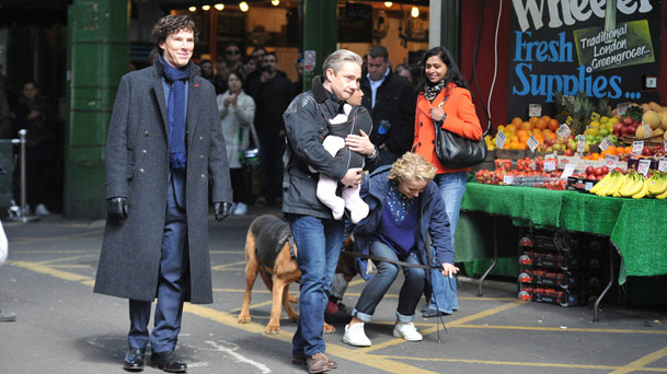 當地時間2016年4月26日,英國倫敦,《神探夏洛克4》熱拍中,華生馬丁-弗里曼(Martin Freeman)變身奶爸胸前抱著孩子,而他現實生活中的女友也同框亮相搭戲.