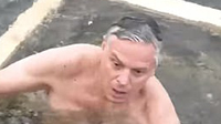 雖然57歲的洪博培走下水時(shí),表情看上去非常勇敢,但全身浸泡在刺骨的河水里后,他不免被凍得有些驚慌。
