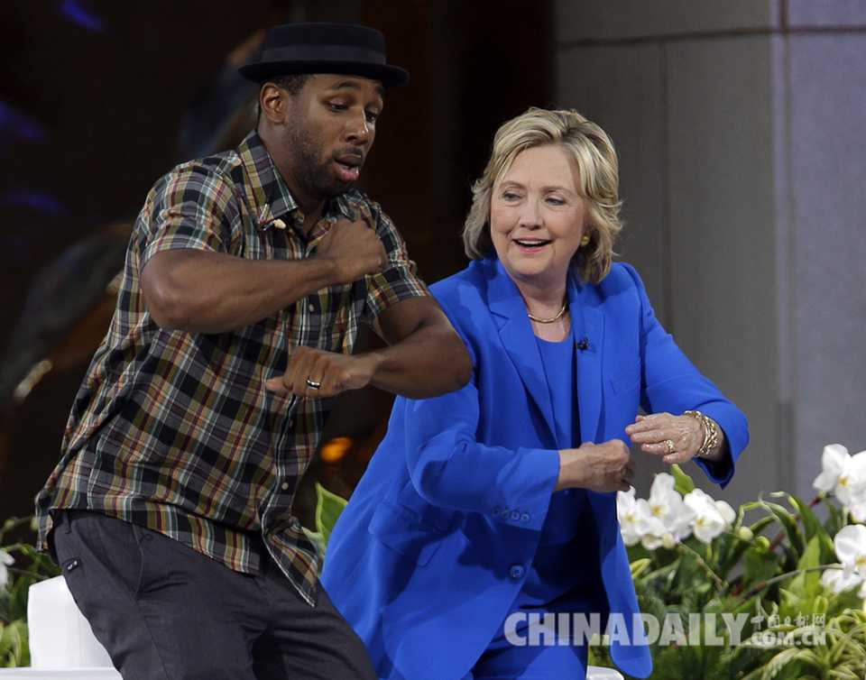 當地時間2015年9月8日,美國紐約,美國前國務卿、2016年總統大選民主黨競選人希拉里錄制全美脫口秀節目《艾倫秀》,與DJ一起熱舞秀親民。