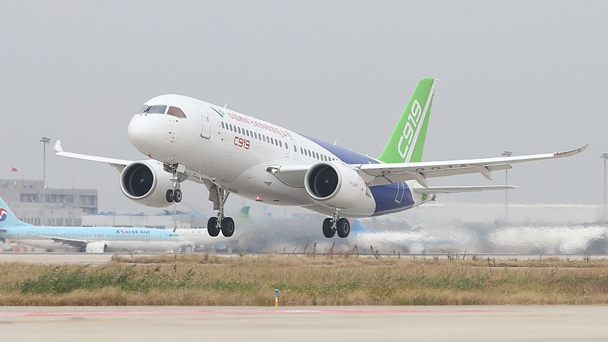 2017年11月10日,上海,國產(chǎn)大飛機(jī)C919起飛前往西安閻良。這是C919的首次遠(yuǎn)距離飛行。