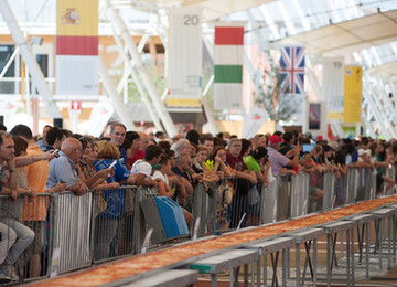 當(dāng)?shù)貢r(shí)間6月20日,2015年米蘭世博會(huì)誕生了一項(xiàng)新的吉尼斯世界紀(jì)錄—一個(gè)長(zhǎng)度約1600米的比薩餅。這個(gè)長(zhǎng)為1600米,寬為1.5米的瑪格麗特披薩已成為世界最長(zhǎng)披薩。