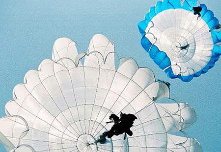 空降場(chǎng)上空傳來了飛機(jī)的轟鳴聲,全副武裝的女子空降隊(duì)隊(duì)員靈敏地操縱降落傘,準(zhǔn)確地在空降場(chǎng)中心位置著陸。