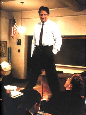 影片中學(xué)生的年齡大約在十七八歲,正是對事物有著自以為是的看法的年紀,一旦對事情有了自己的看法就很難接受別人的意見。Mr. Keating并沒有把自己的想法強加給學(xué)生,而是通過讓學(xué)生印象深刻的舉動--站在桌子上,讓學(xué)生明白一個再簡單不過的道理:當(dāng)你覺得自己正確的時候,一定要嘗試從不同的角度看問題,只有站在不同的角度,你才可能發(fā)現(xiàn)自己原本并不了解的地方。這部分的臺詞自然就成了本片的經(jīng)典臺詞之一。