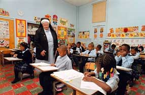 First grade students work on projects under their teacher's supervision at St. Casimir School, a Catholic private school located in downtown Albany, New York. About 50 percent of all private school students in the United States attend Catholic schools.