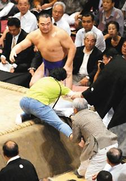 "It's bad for the heart," said Takamisakari, a popular wrestler who helped catch the woman, told the Sports Nippon daily. "What was the person trying to do while we were wrestling seriously?"