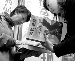 Two women check on the Chinese version of Harry Potter and the Deathly Hallows at a Xinhua bookstore in Beijing. Fans lined up in front of the bookstore before it went on sale at 7 am.[Agencies]