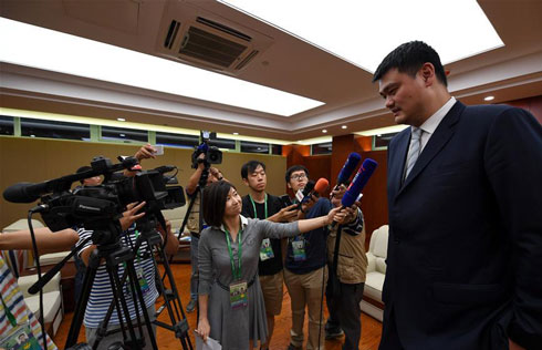 Yao Ming, president of Chinese Basketball Association, is interviewed during the women's basketball final match at 13th Chinese National Games in north China's Tianjin municipality, Sept 6, 2017.
