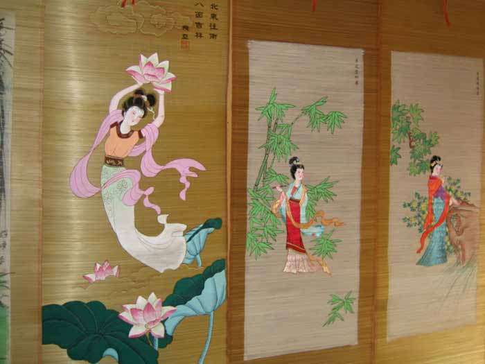 Xiang embroidery is done on transparent chiffon silk. The silk threads are dyed and then soaked in water containing pod nuts - the oil in these nuts makes the thread soft and easy to work with.