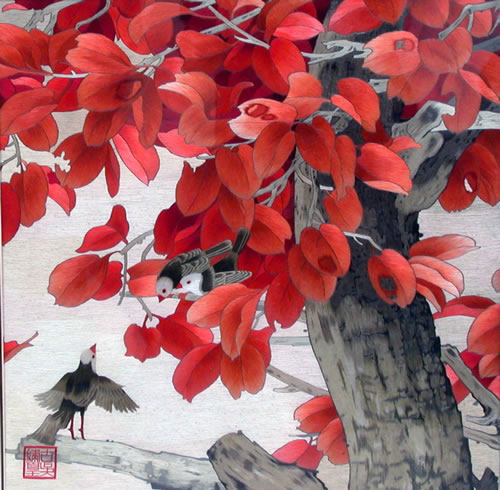 Yue embroidery formed its own unique characteristics during its evolution. In terms of art, Yue embroidery is complicated and crowded in patterns, brilliant in colors, simple in stitch, rough and loose in embroidery threads with irregularly long and short stitches and overlapped patterns. Patterns of dragons and phoenixes, peonies, pine trees and cranes, birds and beasts dominate the embroidery. Floss, thread and gold-and-silk thread embroidery are used to produce costumes, decorations for halls and crafts for daily use.