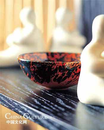 A red porcelain bowl seems more remarkable in the plain background. |