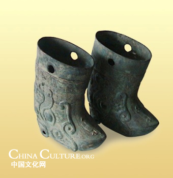 This pair is a handicraft. The Panli decoration on the boots is a typical pattern from the Warring States (475–221 BC). This kind of shoe was introduced to the State of Zhao from the Hu ethnic group, which was the first great innovation in shoe culture in Chinese history. During the Warring States, the king of Zhao introduced the Hu ethnic group’s shoes and clothes into his country so that the army could move more quickly in battle. Therefore, the State of Zhao became one of the seven strongest states at that time. The appearance of boots radically changed military life, political life and even Chinese society. From then on, boots were martial shoes as well as everyday shoes which spread all over the country.
