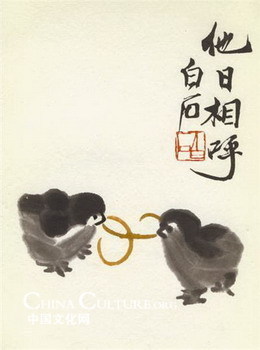 Many paintings by Qi have smart and humorous titles and inscriptions, expressing his views of life. One painting of two chicks fighting for one angleworm is titled "Friends in the Past". A painting of cooked crabs on a plate has the inscription, “Why don’t you move?” This implies Qi’s dislike for imperious or domineering people, which a crab symbolizes in Chinese culture.
