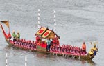 Ornate barges parade past the Grand Palace on the Chao Phraya River during rehearsal of Royal Barge Procession in Bangkok, Thailand, Nov 2, 2012.