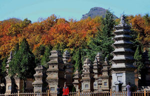 Gorgeous autumn scenery of Shaolin Temple at the foot of the Songshan Mountain in Dengfeng city, central China's Henan province.