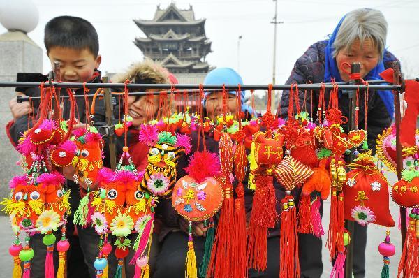 Citizens purchase New Year decorations in a market in Yuncheng, north China's Shanxi province, Jan. 27, 2011. People started to prepare for the upcoming Chinese Spring Festival, which falls on Feb. 3. [Xinhua/Yan Xin]