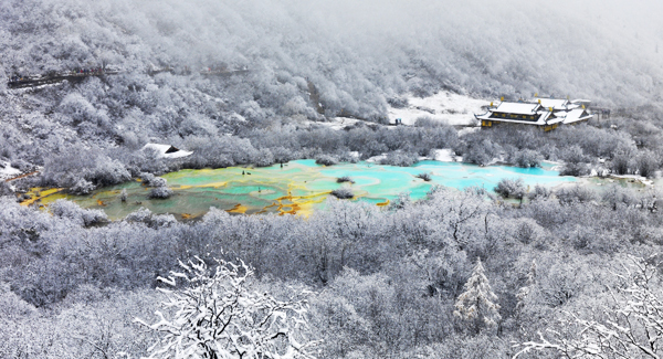 Located in the northwest of Sichuan province, Huanglong Scenic Resort is famed for its colorful lakes, snow-clad mountains, valleys and virgin forests. The well-known attraction features more than 3,000 colorful ponds, sizes of which vary from a few to thousands of square meters. The water in these ponds is azure blue, pure and clear, ranging from inky to shimmering. In winter, the beautiful ponds are blanketed with a white, thin veil, resembling an even purer and more charming wonderland. [Photo by courtesy of Huanglong Natural Resort Tourist Administration]