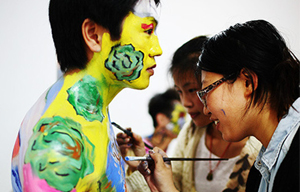 People look at a painting of Antonio Meneghetti, the father of onto-psychology, at an exhibition in Wuhan, capital of central China's Hubei province, May 30, 2013. An exhibition of Meneghetti's paintings kicked off at the provincial museum here on Thursday. Meneghetti, who was supposed to attend his exhibition's opening ceremony, has passed away on May 20 at the age of 77 in Italy.[Photo/Xinhua]