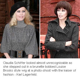 Claudia Schiffer looked almost unrecognisable as she stepped out in a brunette bobbed Louise Brooks style wig at a photo-shoot with the kaiser of fashion - Karl Lagerfeld.