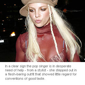Britney Spears has hit a new fashion low.In a clear sign the pop singer is in desperate need of help - from a stylist - she stepped out in a flesh-baring outfit that showed little regard for conventions of good taste.