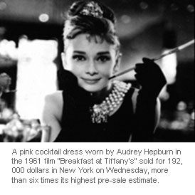 A pink cocktail dress worn by Audrey Hepburn in the 1961 film "Breakfast at Tiffany's" sold for 192,000 dollars in New York on Wednesday.