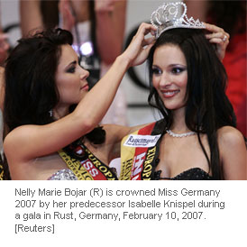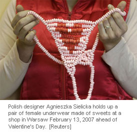 Polish designer Agnieszka Sielicka holds up a pair of female underwear made of sweets at a shop in Warsaw February 13, 2007 ahead of Valentine's Day. [Reuters]