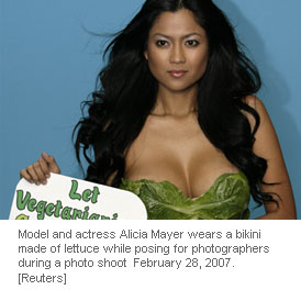 Model and actress Alicia Mayer wears a bikini made of lettuce while posing for photographers during a photo shoot for a new People for the Ethical Treatment of Animals (PETA) campaign promoting vegetarianism in Manila February 28, 2007.