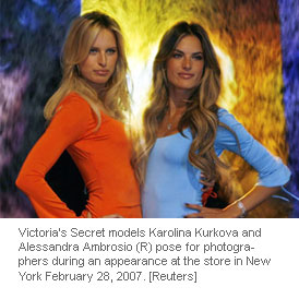 Victoria's Secret models (L-R) Selita Ebanks, Izabel Goulart, Alessandra Ambrosio and Karolina Kurkova pose for photographers during an appearance at the store in New York February 28, 2007. The models were promoting the launch of the company's new Secret Embrace product line. [Reuters]