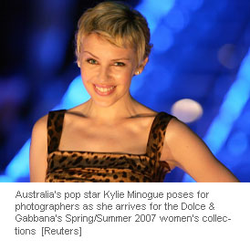 Australia's pop star Kylie Minogue poses for photographers as she arrives for the Dolce & Gabbana's Spring/Summer 2007 women's collections during Milan Fashion Week September 28, 2006. [Reuters]