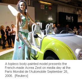 French model Prisca Lafleur presents a Ligier JS 49 prototype racing car on media day at the Paris Mondial de l'Automobile September 28, 2006. The Paris Auto show opens its doors to the public September 30 to October 15.[Reuters]