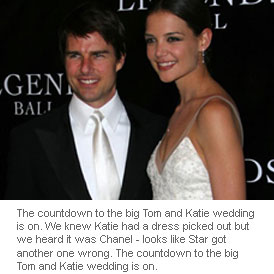 The countdown to the big Tom and Katie wedding is on. We knew Katie had a dress picked out but we heard it was Chanel - looks like Star got another one wrong. Turns out it's Armani and Georgio's working overtime to outfit the stars.