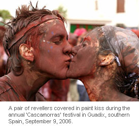 A pair of revellers covered in paint kiss during the annual 'Cascamorras' festival in Guadix, southern Spain, September 9, 2006. The festival was inspired by the dispute between the villages of Baza and Guadix over the possession of the image of the Virgin of Piedad.