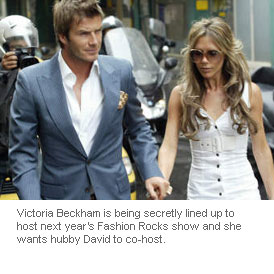 Victoria Beckham is being secretly lined up to host next year's Fashion Rocks show and she wants hubby David to co-host.