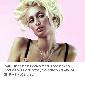 Paris Hilton hasn't eaten meat since meeting Heather Mills McCartney,the estranged wife of Sir Paul McCartney.