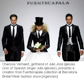 Charisse Verhaert (C), girlfriend of Julio Jose Iglesias (son of Spanish singer Julio Iglesias), presents a creation from Fuentecapala collection at Barcelona Bridal Week fashion show May 30, 2008.
