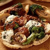 This main dish uses packaged, ready-to-cook broccoli flowerets, mushrooms, tomato sauce, and toasted pitas. It's lightened up with skim-milk ricotta.