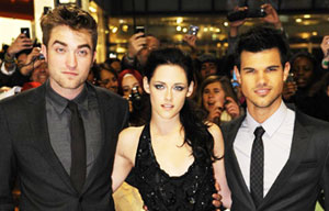 Actors Robert Pattinson, Kristen Stewart and Taylor Lautner arrive for the British premiere of "The Twilight Saga: Breaking Dawn" at Westfield in east London November 16, 2011.
