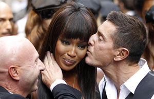 British model Naomi Campbell (C) cries as she meets Italian designers Domenico Dolce (L) and Stefano Gabbana during a party marking the 25th anniversary of her career in downtown Milan September 26, 2010.