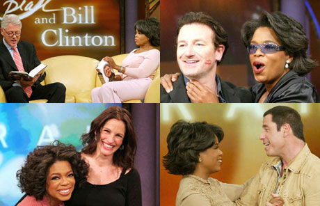 Oprah Winfrey stands between singer and actor Will Smith and his wife actress Jada Pinkett Smith during the taping of "Oprah's Surprise Spectacular" in Chicago May 17, 2011.