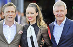 Cast members Harrison Ford, Olivia Wilde and Daniel Craig pose for pictures as they arrive for the German premier of the movie 'Cowboys and Aliens' in Berlin, August 8, 2011.